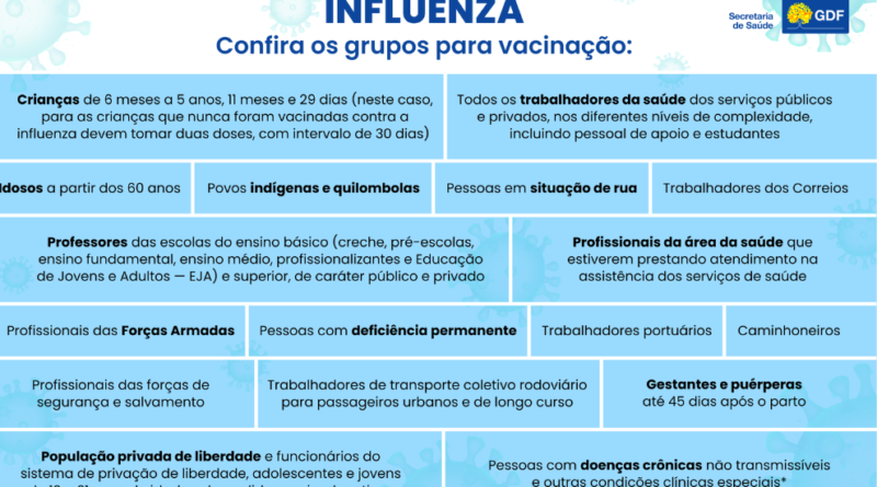 Conforme orientação do Ministério da Saúde, serão vacinadas pessoas de grupos prioritários, entre gestantes, crianças de 6 meses a menores de 6 anos, idosos a partir dos 60 anos e pacientes com deficiências ou doenças crônicas, além de profissionais de áreas específicas. “A vacinação é extremamente importante para proteger as pessoas de se tornarem casos graves da doença, prevenindo hospitalizações e óbitos”, afirma a gerente da Rede de Frio Central da SES-DF, Tereza Luiza Pereira.